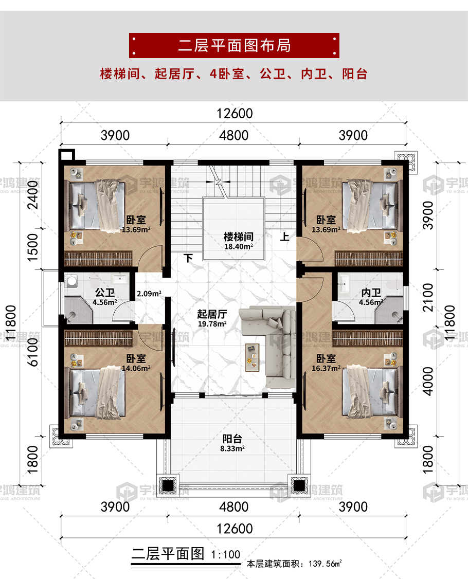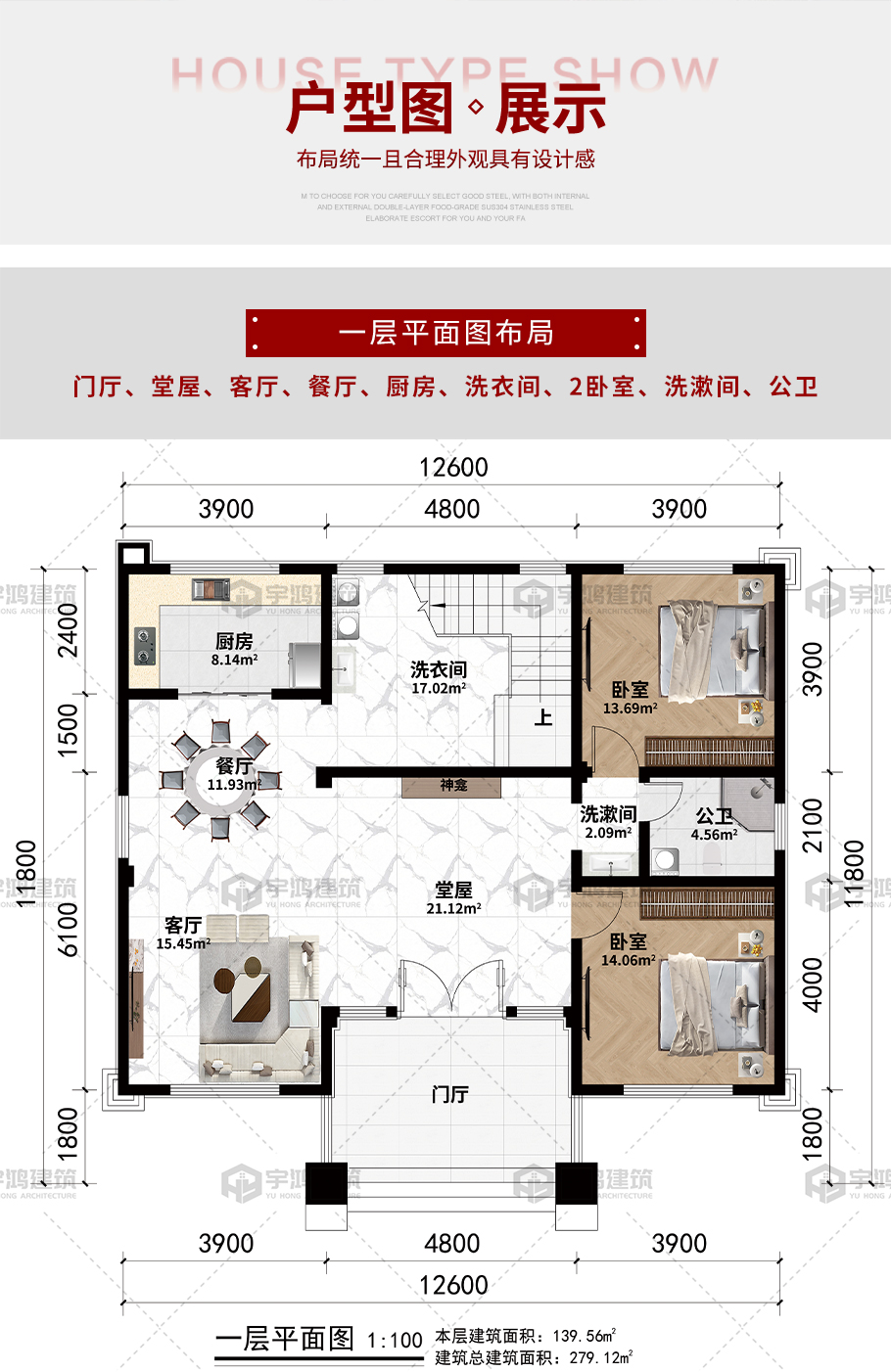 | 開間:12.6米 | 進(jìn)深:11.8米 | 占地面積:139.56平方米 | 建筑面積:279.12平方米 |