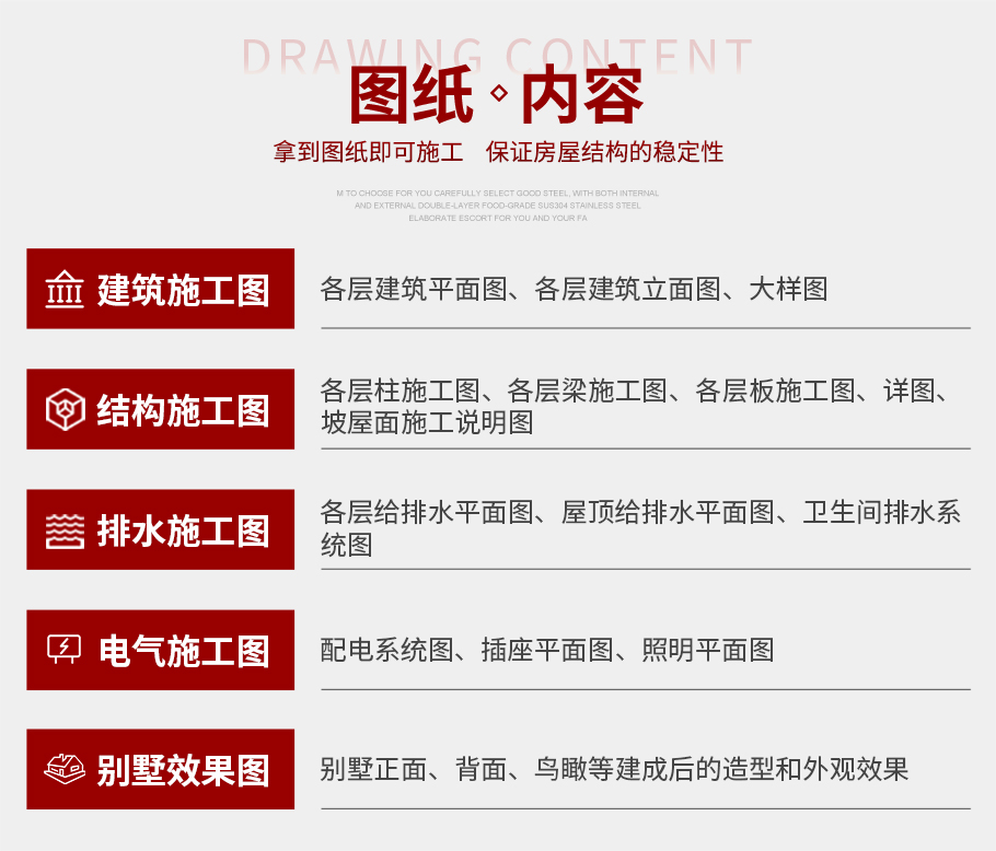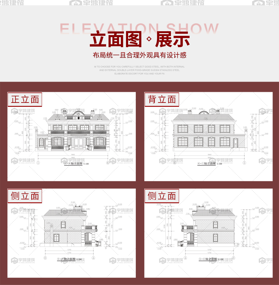 | 建筑圖: | 建筑平面圖:一層平面圖,二層平面圖; 建筑立面圖:東立面圖,西立面圖,南立面圖,北立面圖,剖面圖; 大樣圖:樓梯詳圖,細(xì)部大樣,門窗大樣 |