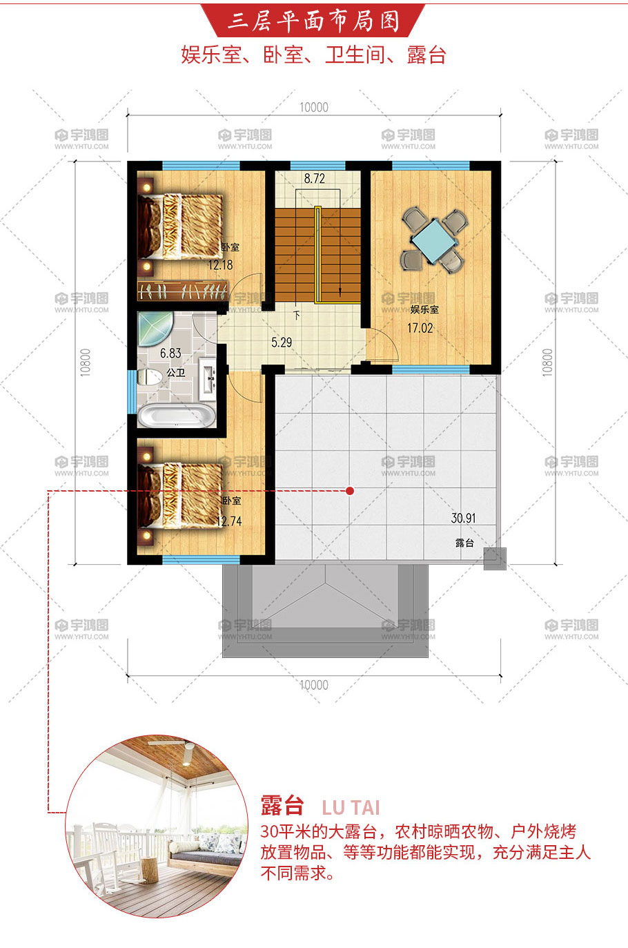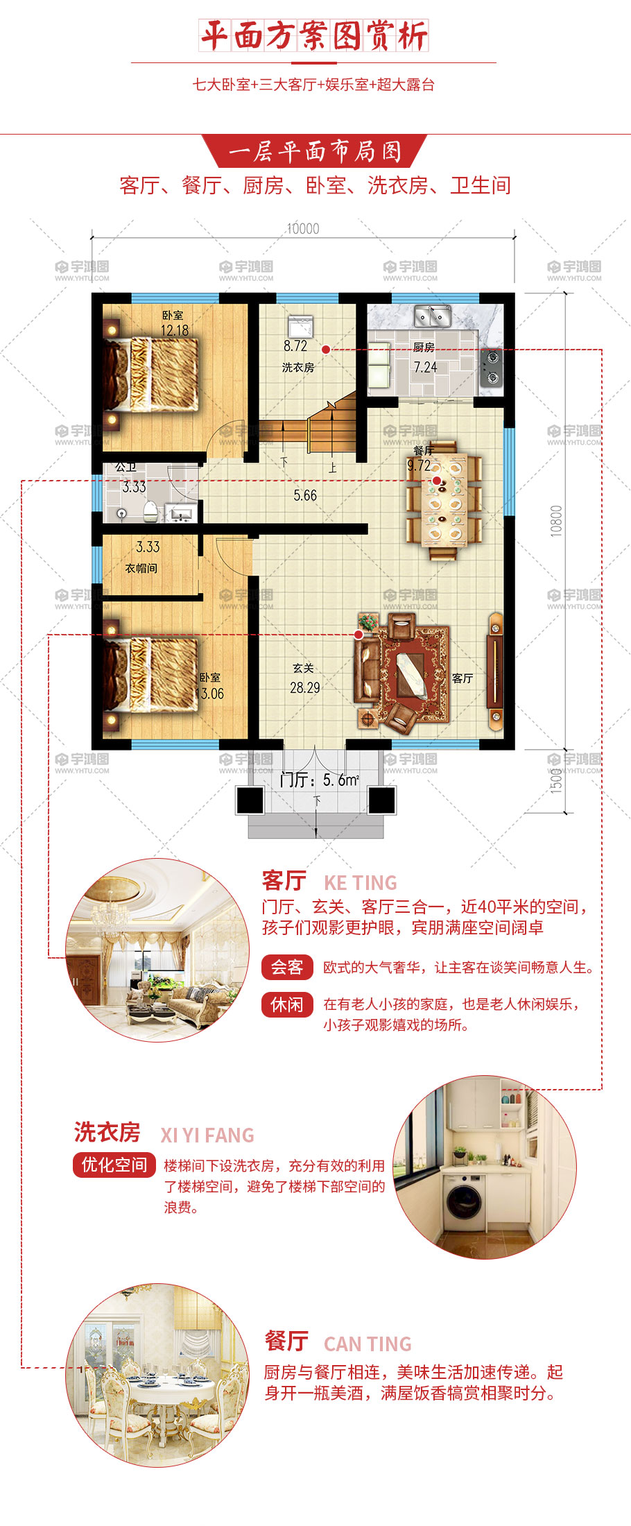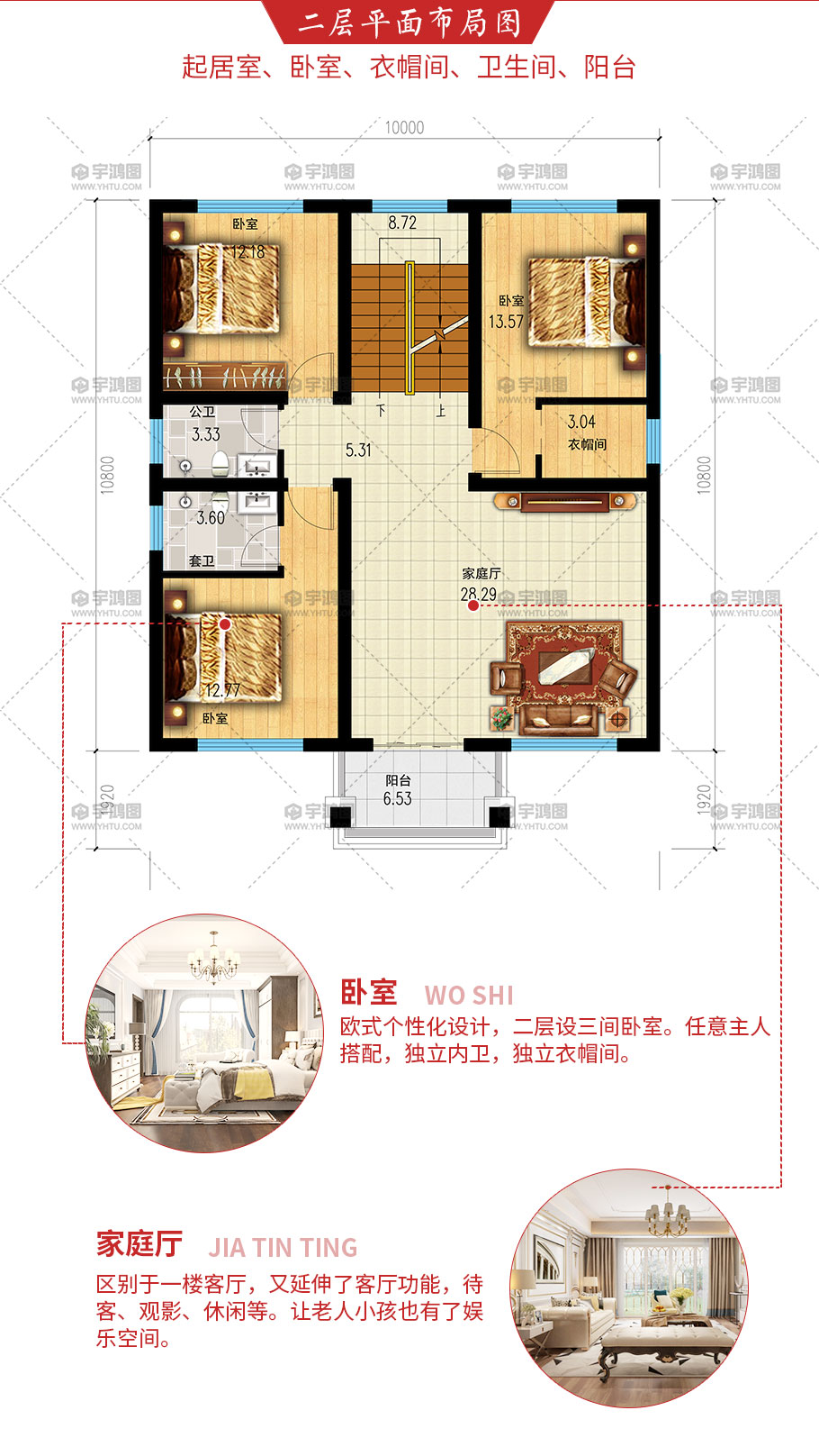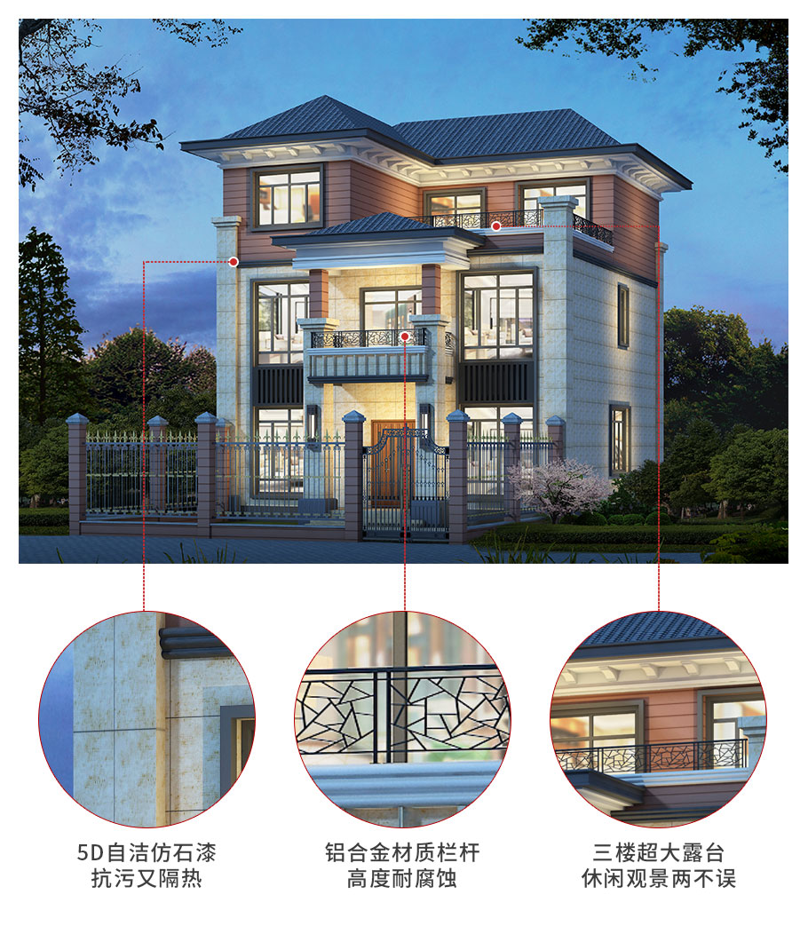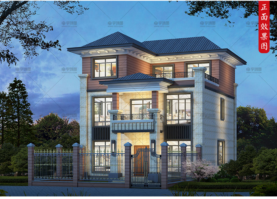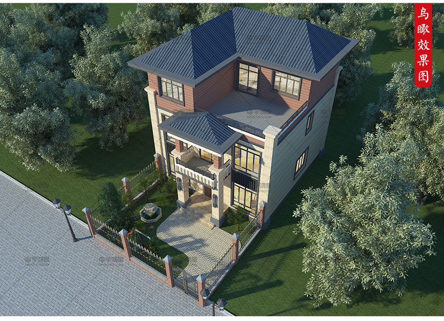 2021新款農(nóng)村三層歐式別墅設(shè)計(jì)圖紙,本戶型為農(nóng)村三層歐式風(fēng)格別墅設(shè)計(jì)圖,復(fù)式結(jié)構(gòu)中空客廳,戶型尺寸為10×12.3米,該戶型外觀主要以暖色系裝飾,坡屋頂高低錯(cuò)落很有層次,外立面結(jié)構(gòu)豐富,色彩搭配簡(jiǎn)潔大方,室內(nèi)布局規(guī)劃合理精確,主臥帶有衣帽間,三層設(shè)有大露臺(tái),適合現(xiàn)代新農(nóng)村建房。